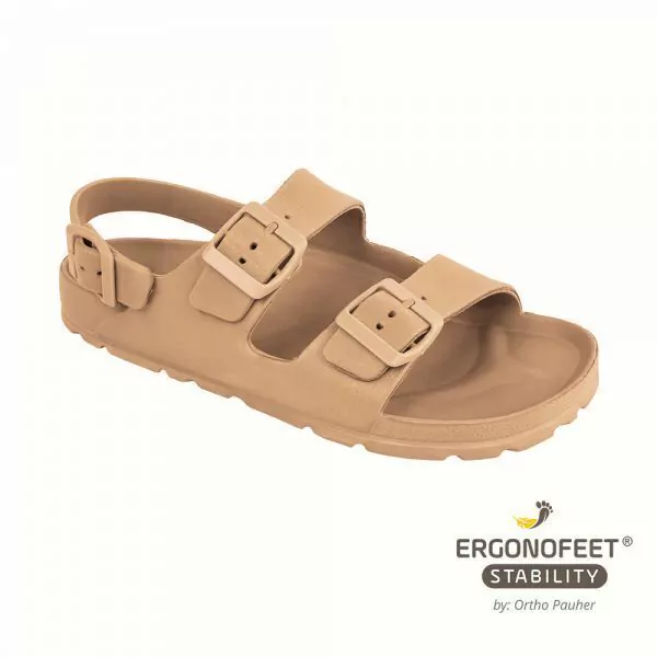 A Sandália Ortopédica Ergonofeet Stability foi desenvolvida com arco medial modelado com abóboda plantar para acomodar o formato anatômico da parte interna de toda extensão da planta dos pés. Possui Piloto plantar ressaltado na abóboda para evitar demasiada pressão e atrito na região metatarsal. Conta ainda com depressão na região do calcâneo em formato de copo que ajuda a estabilizar, dar suporte e realinhar os pés e tornozelos na posição correta oferecendo maior controle ao caminhar. Indicada para proteção e prevenção primária e/ou secundária para esporão de calcâneo, fascite plantar, Neuroma de Morton, metatarsalgia, formação de calos e hiperqueratose, idosos e alívio das dores.